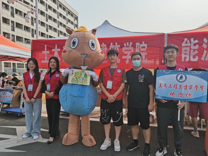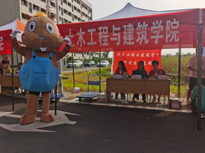 上午7点,学院辅导员韩建康老师带领着研究生党支部的党员和志愿者们和学院的吉祥物“砼砼”在接待点迎接新同学们。