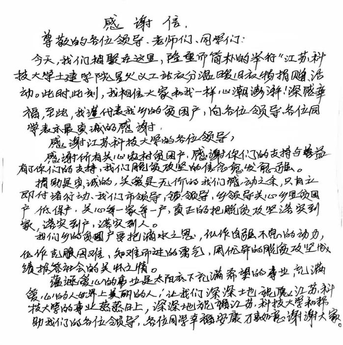 近日,bwin必赢收到来自内蒙古赤峰市喀喇沁旗王爷府镇汤土沟村困难群众寄来的一封感谢信,感谢学校捐赠的200余件过冬衣物。