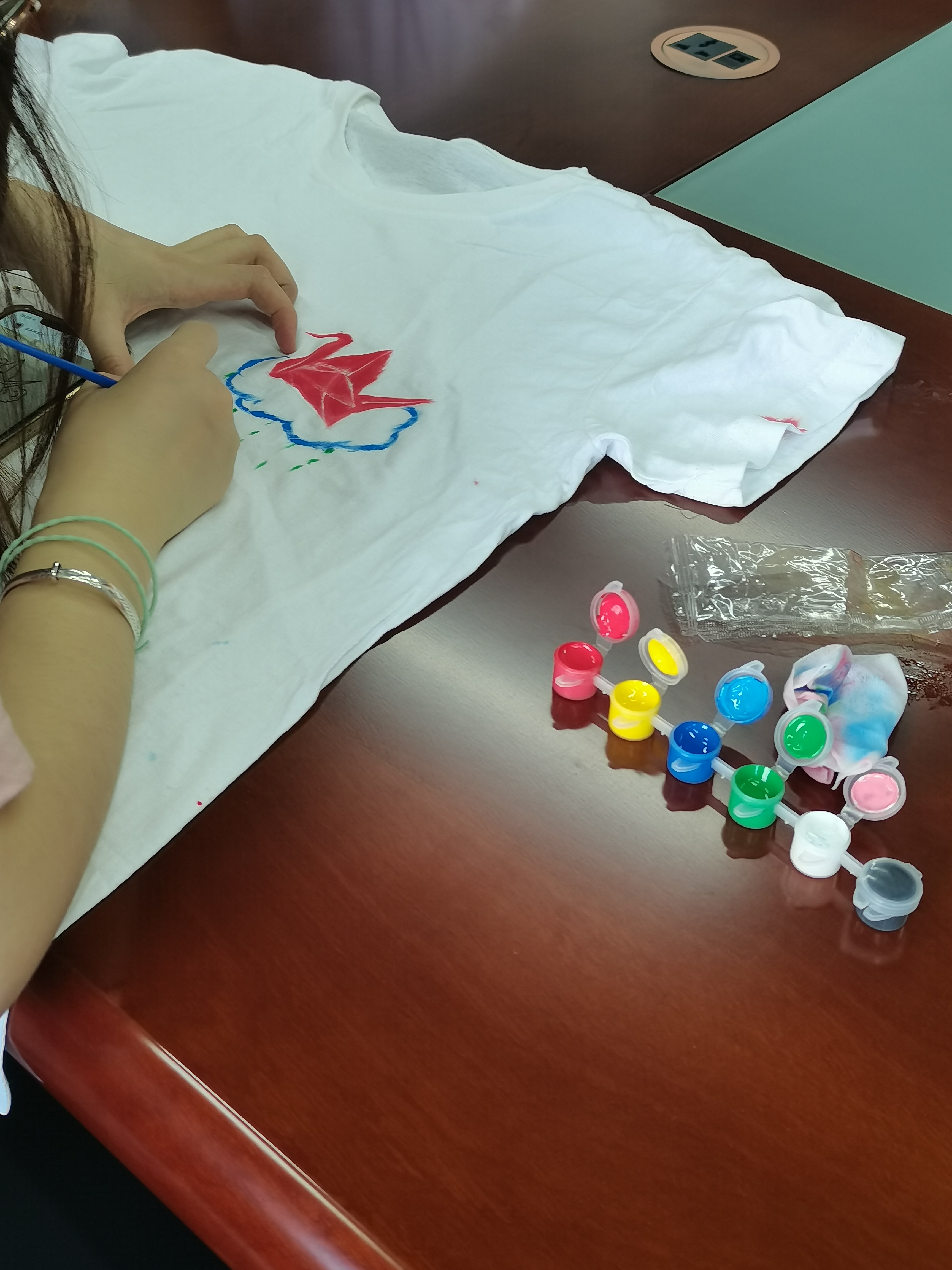 整个母亲节活动以体悟生命、感恩母亲为出发点,共分为彩绘T恤、 告白母亲、祝福母亲等三个环节。活动第一项:彩绘T恤,以图画与文字相结合的形式,在一方小小的T恤衫上,挥洒灵感与才艺,赋予作品积极向上的象征意义,描绘出自己对生命的领悟。我们用自己的双手,与色彩相拥,在纯白的棉布上绘出心中最美的青春。经过四十五分钟的创作,大家都基本上完成了。在接下来的环节中,大家介绍了自己带创作灵感和思路。有位同学画了一只千纸鹤,她说“身在外地求学的我们,在母亲节不能陪在母亲节身边,我画了一只千纸鹤,希望她能把我对母亲的思念带给母亲。”还有几个女生说“我们画了一些甜甜圈,爆米花,妈妈总是骗我们说她不爱吃这些东西,总是把好吃的留给我们,我希望妈妈也可以多考虑考虑自己。”还有的男生画了玫瑰花,不爱表达爱的男生也有心思细腻的一面。“小时候都是爸爸妈妈带我认识世界,我画了飞机,以后我要带着爸爸妈妈去旅行,去大海边,去草原,去看日出,带他们去看不一样的风景。”最亲密的话往往最难说出口,借彩绘T恤的活动去一笔一画中寄托对母亲的思念和感恩。