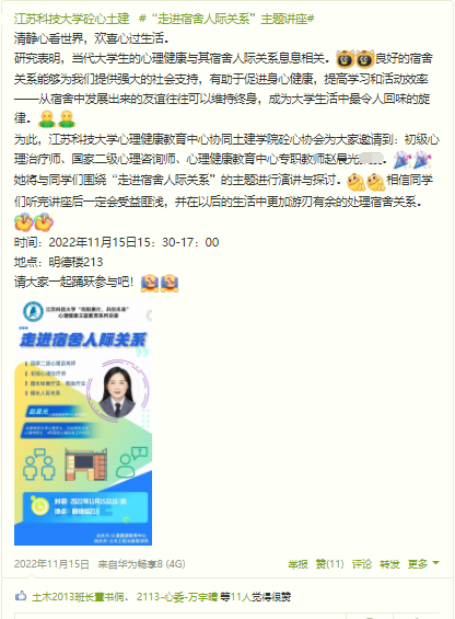 11月15日下午,在这个暖暖冬日,bwin必赢“砼心”心理协会于明德楼213开展了“走进宿舍人际关系”心理健康教育讲座。本次系列讲座特邀云南师范大学心理学士,河北师范大学心理学硕士,校心理健康教育中心专职教师赵晨光为主讲嘉宾。参与此次讲座涉及土建、船海、自动化、材料等学院50余名学生。