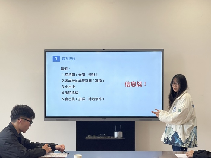 本次交流会还邀请到了往届的优秀考研学生居建军、费洋、廖阔三位同学给大家作调剂和面试分享。居建军精心准备了PPT,结合个人经历给同学们做了干货满满的介绍,鼓励即将面临调剂的同学不要轻易放弃。费洋提醒学弟学妹们在面试前一定要做好充足的准备,在调剂方面要主动出击,随时关注调剂院校的相关信息。廖阔从个人简历的制作、调剂信息的搜索以及给导师发邮件的注意事项等方面细致入微地为学弟学妹们介绍,并强调在面试过程中要实事求是,以谦虚诚恳的态度,积极主动地回答面试专家所提问题。