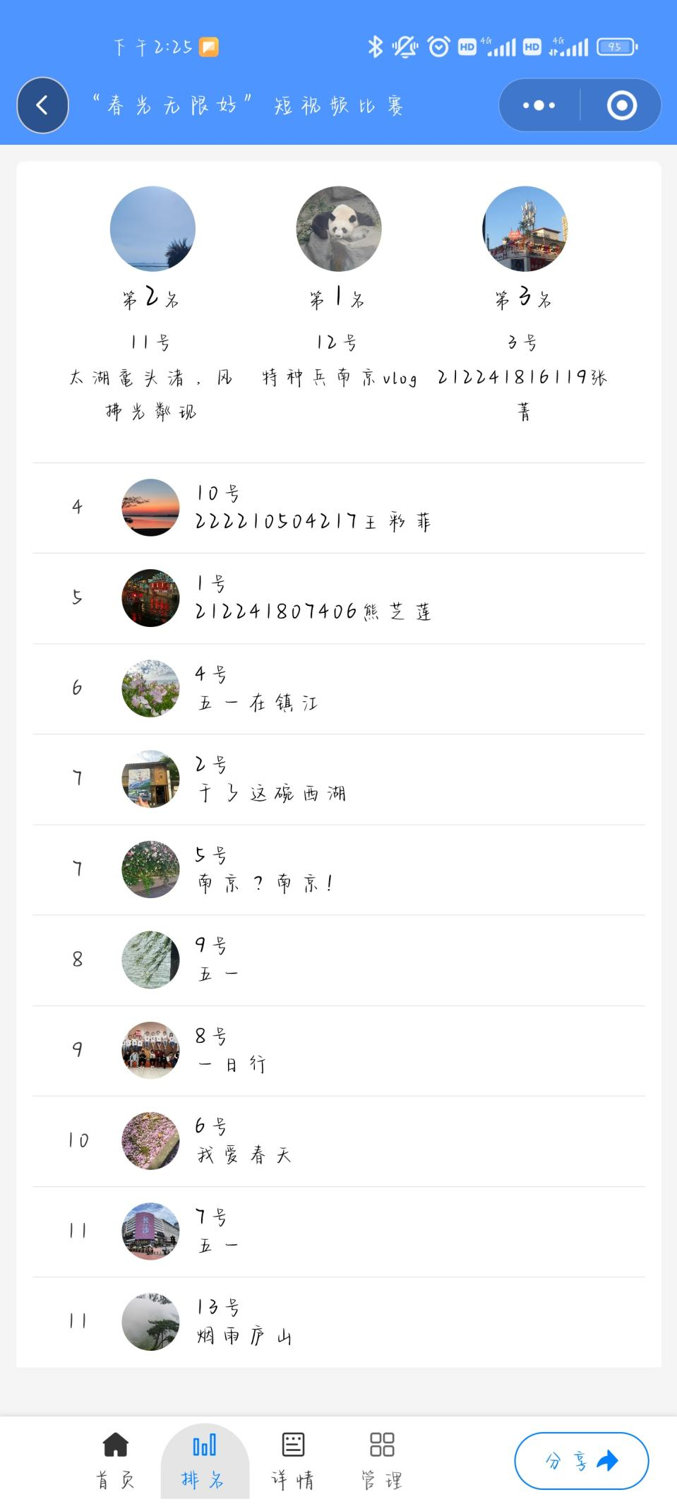 整场活动从作品征集到层层选拔历经半个月,最终评选出同学们心中的前三名。通过大家投稿的短视频可以看见,疫情解封后,多数大学生选择了去各地旅游弥补三年的遗憾。有去天津找对象结束异地恋的;有约上三五好友去最近的南京游玩的;有到各省爬山,一览众山小的;也有留在镇江参加活动,丰富课余生活的...最后根据线上投票结果,选出了一等奖一位,二等奖一位,三等奖两位同学,活动参与奖九名。参与活动的朱同学说,因为这次的短视频征集活动,在外出游玩中我更加留意到从前没有发现到的美好,感谢活动让我用镜头留住了它们。相信这些美好的记录会在我今后考研的路上缓解我的焦虑,成为更强大的自己。