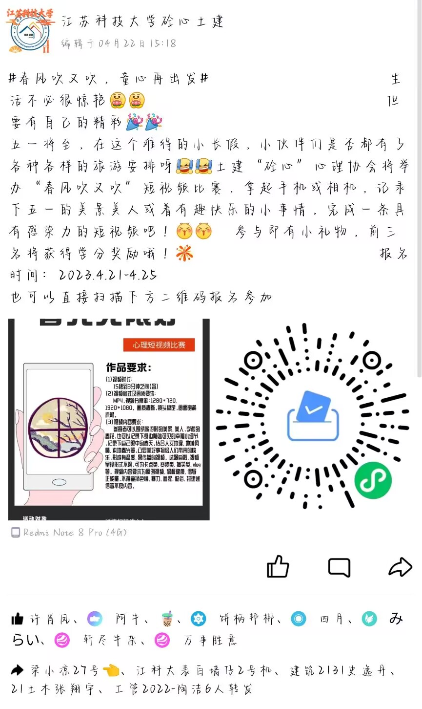 为了缓解后疫情时代带给学生的压抑与忧虑,进一步激发同学们的创造性思维,丰富课余生活,推动大学生展现不同的青春风采。bwin必赢“砼”心心理协会围绕“重塑心秩序、青春再启航”心理健康教育理念组织开展了一场以“春光无限好”为主题的5·25心理短视频征集比赛,土建、深蓝、计算机等学院学生13余人参与。