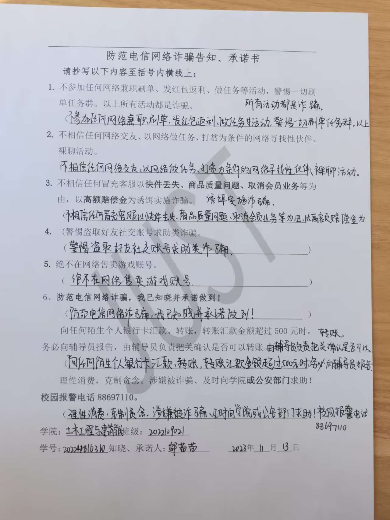 各班级班主任以及班级学生干部通过主题班会形式加强安全教育的整体宣传,广泛开展交通安全教育、消防安全教育、食品安全教育、反诈骗安全教育等相关主题宣讲,引导学生进一步增强安全教育意识和法治观念,牢固树立正确的世界观、人生观和价值观。各班的主题班会活动丰富生动、形式多样,同学们纷纷表示:生命至上,要遵守交通规则,提高反诈防骗意识,做到敬畏法规,敬畏生命。