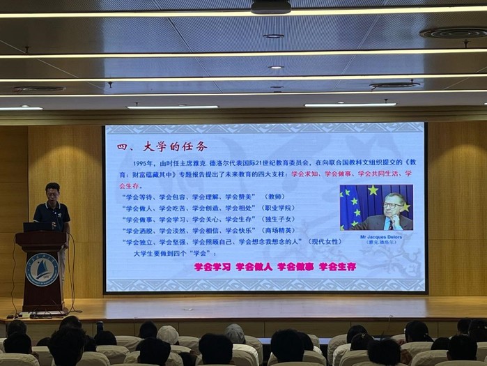 随后,学院党委书记李红明以“厚德砺能、筑基建业”为主题为2025级全体新生讲授了开学第一课。围绕“学习与大学”“大学教育目标”“大学任务”以及“四个学会”等方面展开,引导学生树立远大理想、明确学业目标、规划人生方向。