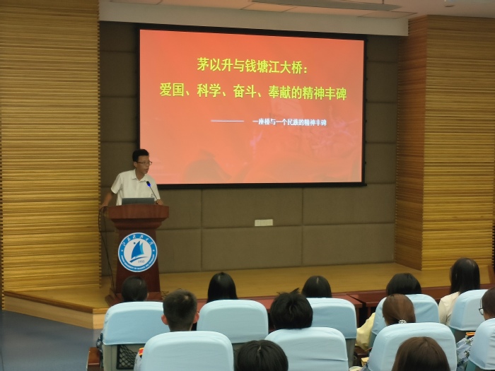 2025年9月22日,在图书馆报告厅101成功举办以“茅以升与钱塘江大桥:爱国、科学、奋斗、奉献的精神丰碑——一座桥与一个民族的精神丰碑”为主题的专题讲座。本次讲座由学院党委书记李红明主持,特邀茅以升纪念馆副馆长张浩担任主讲人,学院2025级全体新生到场聆听,共同感悟桥梁大师茅以升的爱国情怀与科学精神,以及钱塘江大桥所承载的民族记忆。