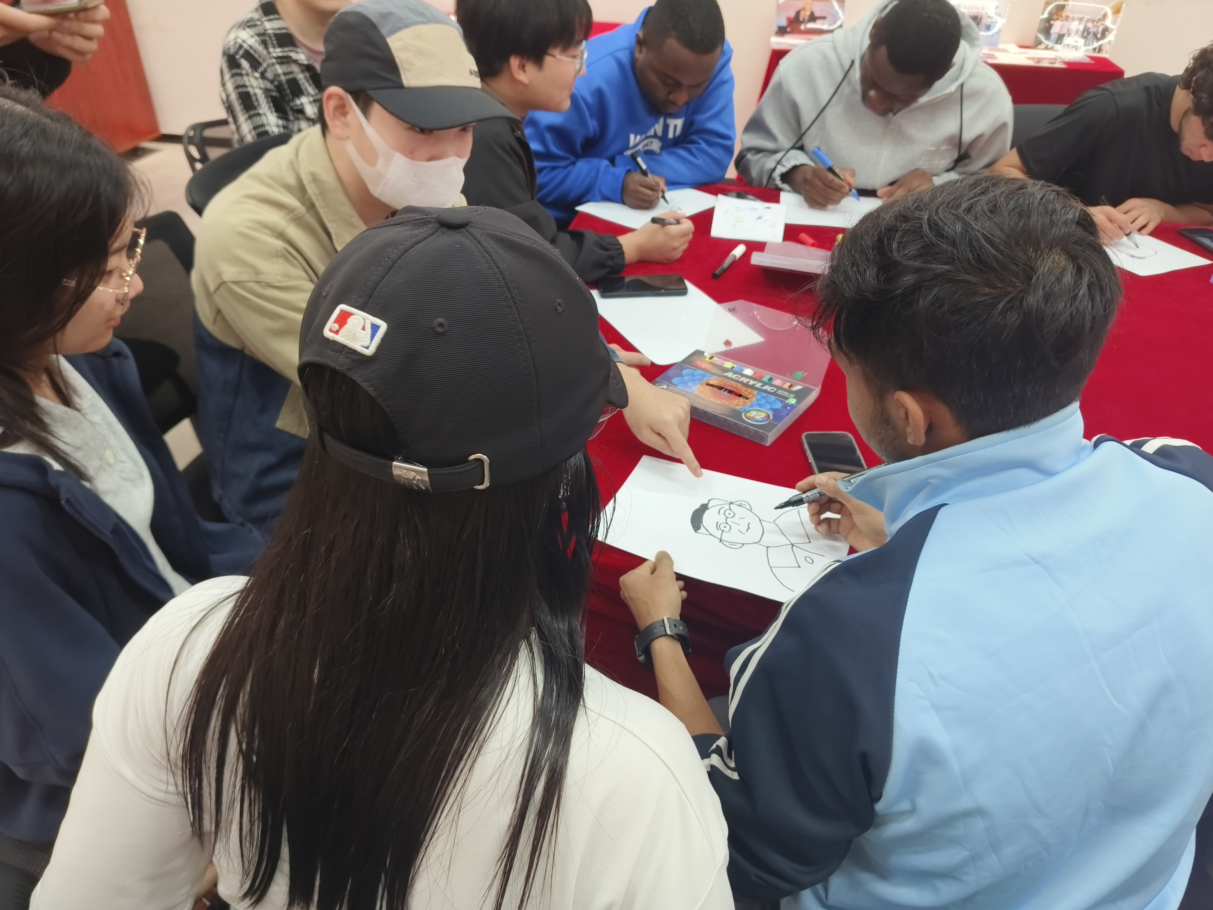 随后,中外学生合作绘画环节在308教室展开。教室中陈列茅以升半身雕像与事迹展板,同学们自由组队,围绕“心中的茅以升桥”主题进行创作。大家借助历史资料与桥梁结构图,在画纸上融合桥梁元素与文化理解。现场交流热烈,中国学生用双语讲述茅以升“建桥报国”的事迹,国际学生也分享本国桥梁文化,不同背景的青年在协作中激发创意与友谊。作品风格多样,或写实细腻,或抽象抒怀,或融汇中西,充分呼应“桥连中外”的主题。